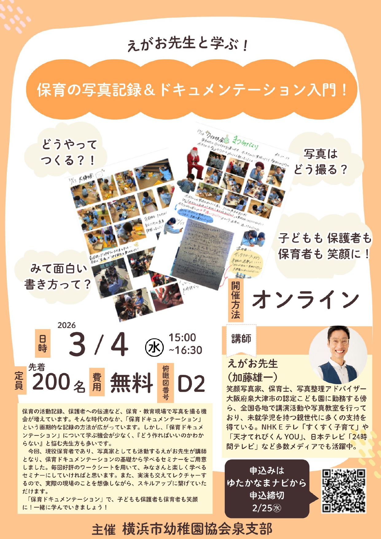 横浜市幼稚園協会泉支部さま主催で、セミナー「えがお先生と学ぶ!保育の写真記録&ドキュメンテーション入門!」を実施します。 オンラインでの実施で、現在60名以上がお申込みしてくださってい