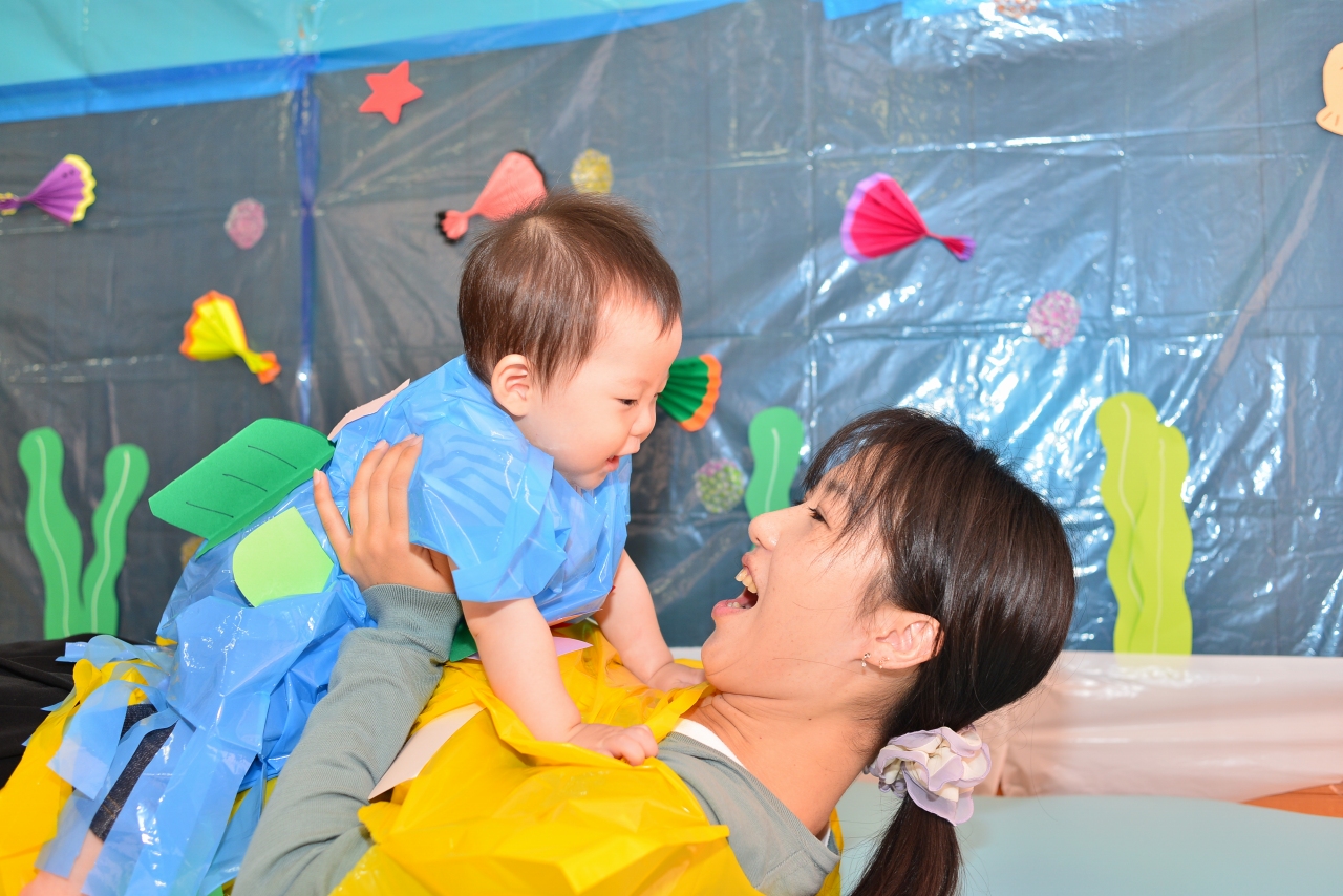 月に一度の親子広場での撮影会イベント♪場所は大阪府泉大津市にある認定こども園とれぞあ子ども園内にある親子広場「ふるーる」。今回のなりきりテーマは「さかなになろう!」です。海の中をすーいすーいと親子で泳ぐシチュエーションを演出します。さあ、どんななりきりが誕生するのでしょうか!?
