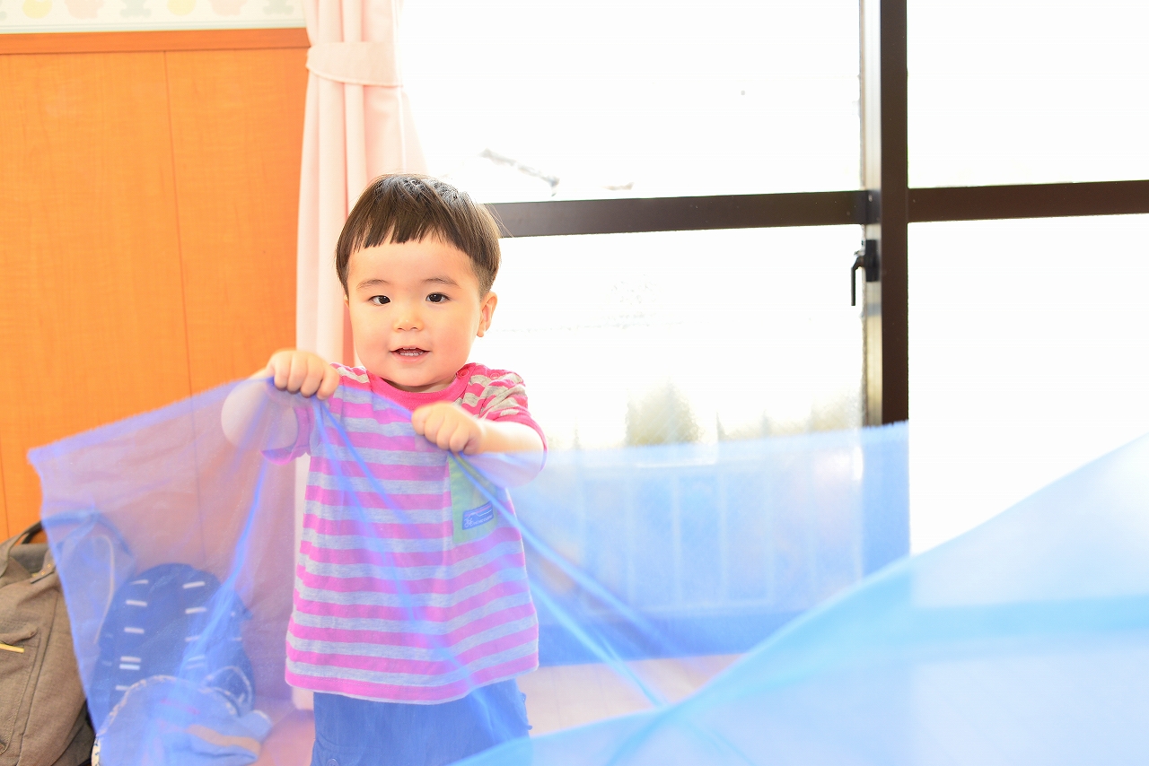 子どもたちは大はしゃぎ!!!ブルーシートのがさがさという音、顔に吹いてくる風、ママたちの「そりゃ~」という声が合わさって、子どもの心をくすぐります。